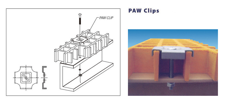 For the ultimate in holding capacity of square mesh molded grating, the exclusive American Grating PAW clip should be specified. These clips clamp 4 load bars to the support, offering excellent bidirectional resistance to loads from seismic or other lateral forces.