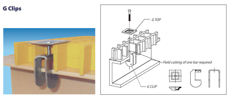When drilling the support member has to be avoided, G clips offer the solution. The lower jaw of the clip grips the support flange when the bolt is torqued. A heavier top clip then completes the assembly to carry the loads. Providing excellent bidirectional holding capability for molded square mesh grating.